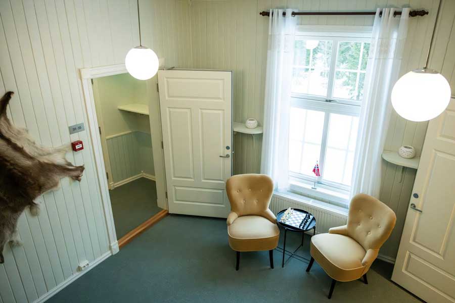 Via een eigen ingang binnen het hotel kom je bij de familiekamer, welke bestaat uit twee authentieke slaapkamers. Eén met een tweepersoonsbed en één met een stapelbed waarvan het onderste bed een twijfelaar is. De bedden hebben allen een heerlijk Noors matras. Daarnaast is er een badkamer met twee toiletten en één douche. Een privégedeelte van het hotel dus; ideaal voor gezinnen!