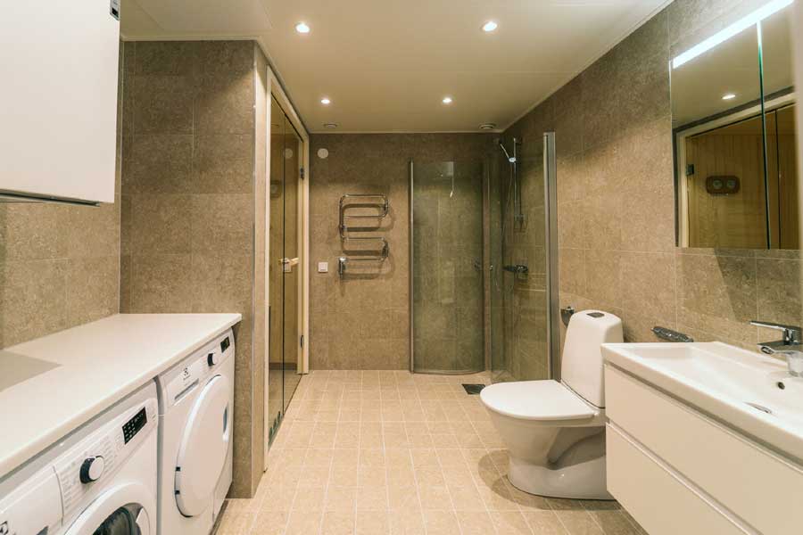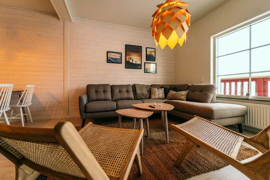 Moderne, gezellig ingerichte appartementen, perfect voor een gezin met kinderen of een groep. Woonkamer met zitbank en eethoek, televisie en de meeste appartementen hebben een hout kachel. Volledig ingerichte open keuken met elektrisch fornuis, oven, grote koelkast met ruim vriesdeel, vaatwasser, magnetron. De badkamer heeft een sauna, douche en toilet en tevens een wasmachine (soms ook wasdroger), tweede badkamer met douche en toilet. Elk type heeft een slaapkamer met een tweepersoonsbed. De daaropvolgende slaapkamers hebben of een stapelbed voor twee personen of een familie-stapelbed (breed onderbed). Verder is er in de hal een droogkast voor skikleding. Draadloos internet, tevens is er gratis WiFi in de surfzones van Kläppen en bij het Velkomstcentrum.
